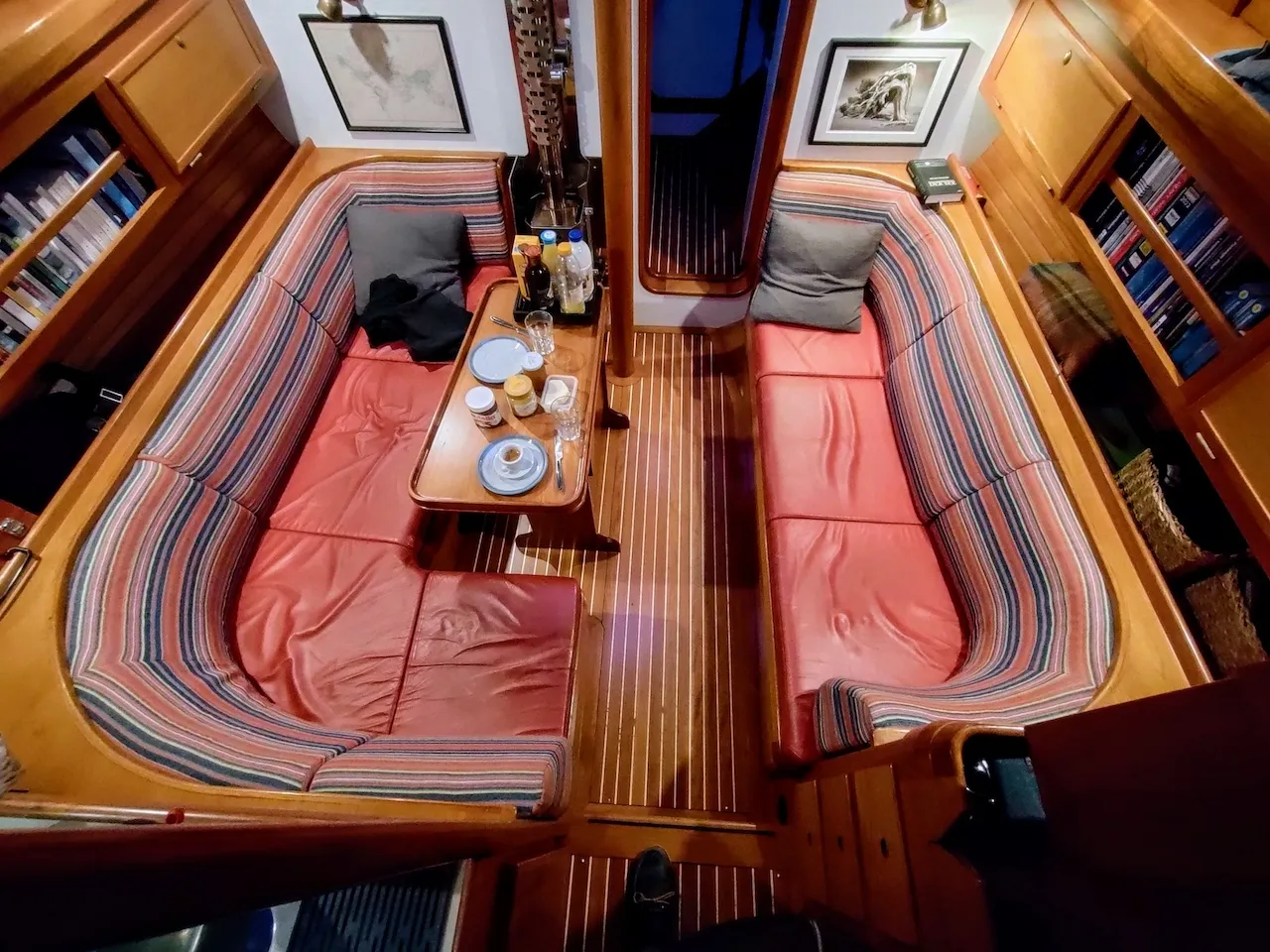 In 2025, the guys at Hutting again made sure that Coelacanth continues to reach her full beauty and function. The bed mattresses and the salon upholstery were renewed by Jaarsma & Silvius in Frisian town Sneek which made a huge improvement in the interior atmosphere of Coelacanth. The teak warmly glows next to the fabric of the salon benches (Sunbrella Lopi Marble).